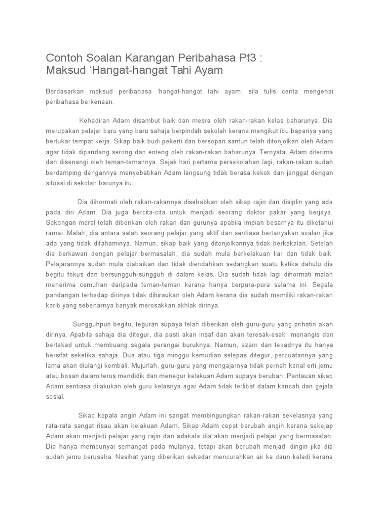 Berikut adalah contoh soalan karangan bahasa melayu tingkatan 3 serta cara pemarkahan yang boleh dipraktikkan oleh. Berikut beberapa soal peribahasa yang sering kita dengar dalam kehidupan sehari-hari diikuti dengan kunci jawabannya. Ia selalu bersemangat untuk menggapai cita-citanya.